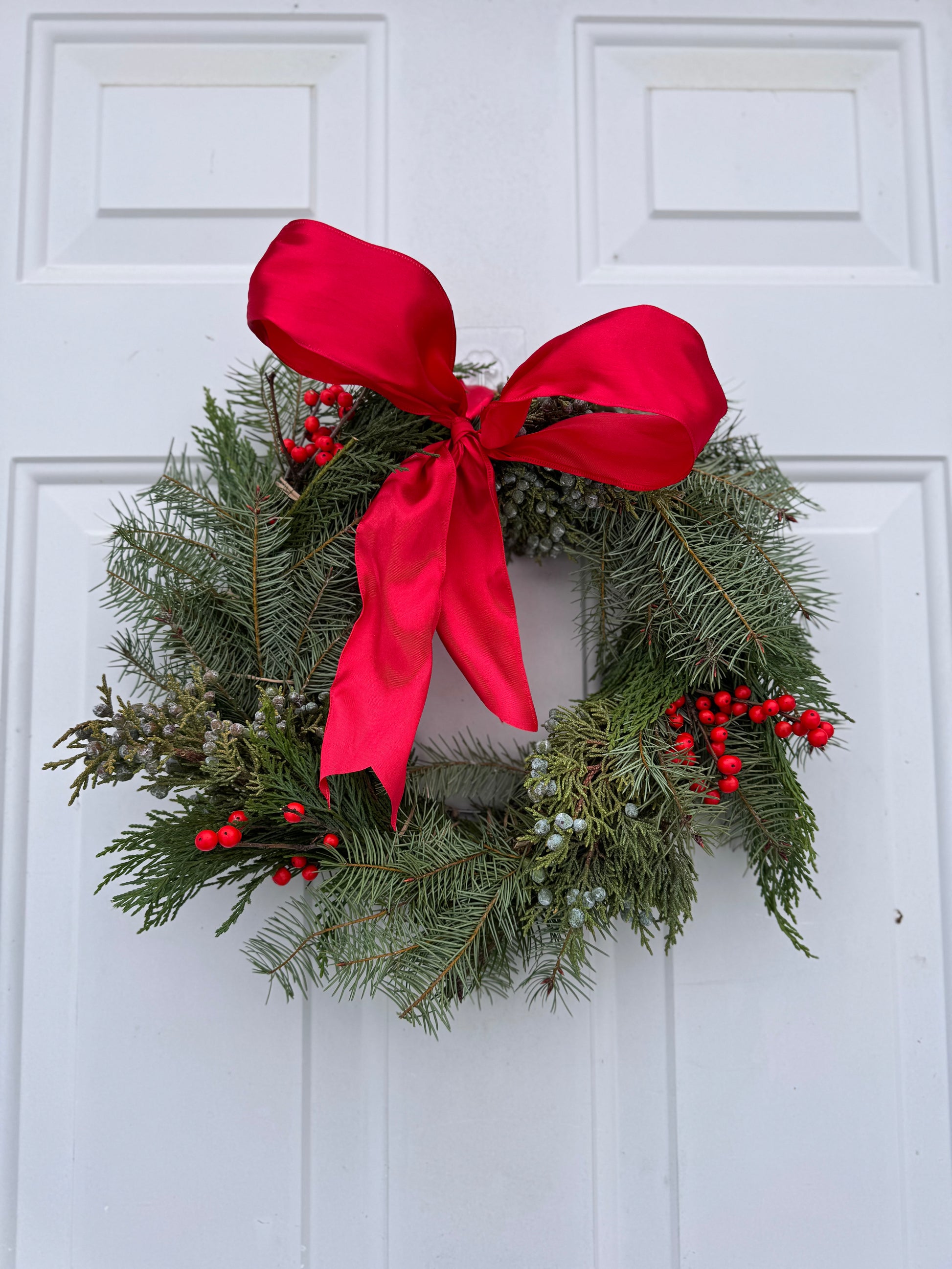 A mix of fresh evergreens dried oranges, curly willow and choice of ribbon.